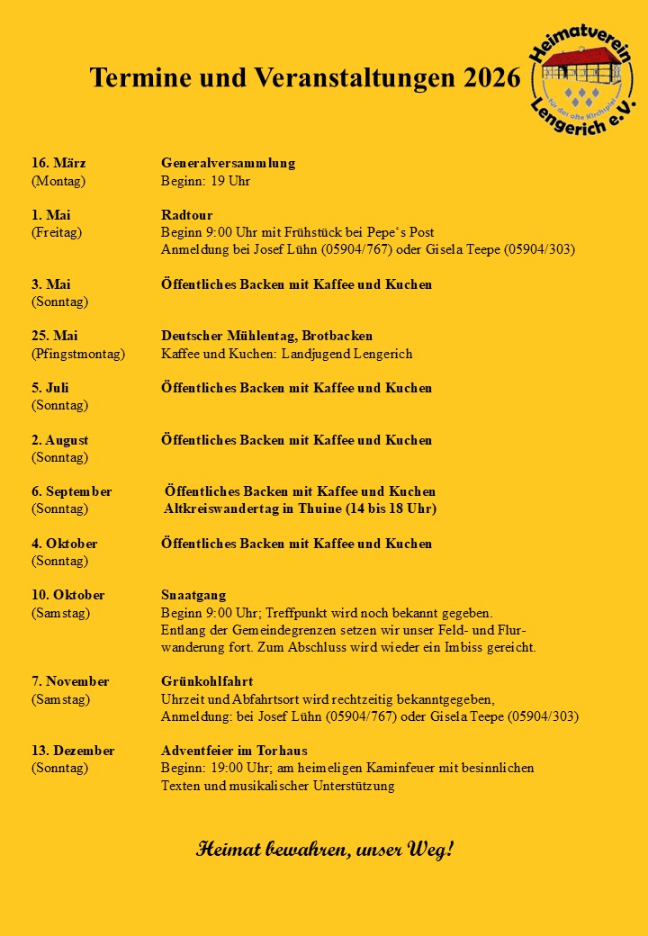 Der Heimatverein für das alte Kirchspiel Lengerich hat auch in diesem Jahr wieder ein abwechslungsreiches Programm zusammengestellt. Alle Mitglieder und Interessierte sind herzlich eingeladen, an den Veranstaltungen teilzunehmen.